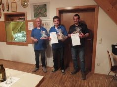 Gegen 22.30 Uhr konnte Vertrauensmann Paul Jörg die Siegerehrung vornehmen und die einzelnen Teilnehmer beglückwünschen. Die drei besten Teilnehmer erhielten einen kleinen Vesperkorb. Alle Teilnehmer erhielten eine Urkunde mit dem erreichten Platz. Den 3. Platz erreichte Karl Kley, Dürrenstetten, den 2. Platz erreichte Hans Oberdorfer, Gundelfingen und auf das Siegertreppchen reichte es dieses mal Franz Müller aus Gundelfingen. Die Sieger können nun am 22. Mai bei der Kreismeisterschaft in Glems teilnehmen und Ihren Most dort bewerten lassen.