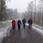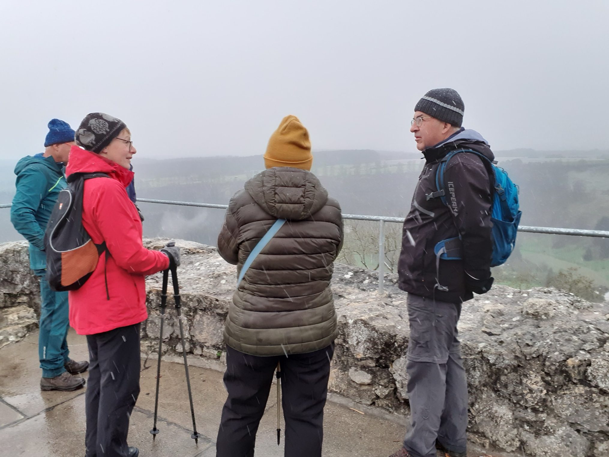 Unsere Frühwanderung der Sonne entgegen wurde kurzfristig in eine Frühwanderung in den Schnee umgewandelt. Bei ca +/- 1 Grad Celsius haben sich doch 6 Wagemutige Wanderinnen und Wanderer bei trockenem Wetter eingefunden um die herrliche Morgenluft und das schöne Vogelgezwitscher in sich aufzunehmen. Die Wanderstrecke durch das Lange Tal dann den Heinenberg empor zum Klösterle brachte uns bald zum schwitzen. Auf der Hochfläche mit Blick in Richtung Dürrenstetten wanderten wir durch das Ober Lau zur Burgruine Hohengundelfingen. Hier hatten wir einen Ausblick im Schneegestöber. Der Rückweg führte uns zum Radschuh, Stettener Halde und direkt ins Zollhaus. Dort kamen wir ein bisschen eingeschneit an. Wir wurden mit einer warmen Stube sowie mit einem herrlichen Frühstück, vorbereitet von Armin Failenschmid und Franziska Jörg empfangen. Nun gesellten sich noch ein paar Gäste zu uns, die sich heute morgen noch nicht in die Natur getraut haben.