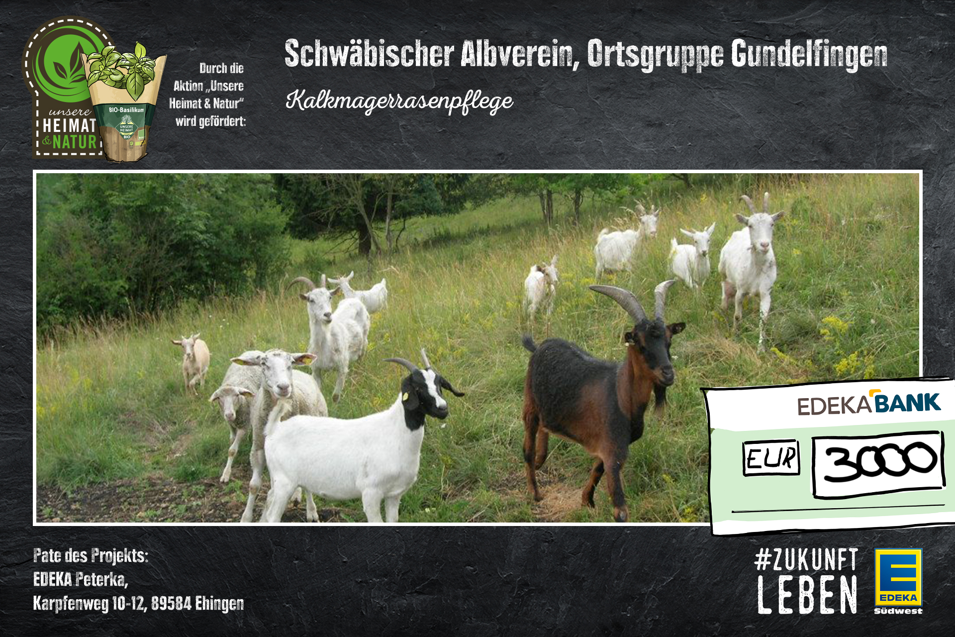 In Münsingen-Bichishausen auf dem Bürzel überreichten Michaela Meyer, Geschäftsbereichsleiterin Nachhaltigkeit bei Edeka Südwest sowie Edeka-Kaufmann Ralf Peterka, von EDEKA Ehingen der die Patenschaft für das Projekt übernommen hat, den symbolischen Scheck in Höhe von 3.000 Euro an Paul Jörg, Vorsitzender der Gundelfinger Ortsgruppe des Schwäbischen Albvereins. „Wir freuen uns sehr, dass es so viele mutige und engagierte Menschen und so großartige Naturschutzprojekte in unserem Absatzgebiet gibt und sind stolz, hier einen Beitrag leisten zu können. Denn nur in einer ökologisch intakten Kulturlandschaft können auch qualitativ hochwertige Lebensmittel produziert werden“, erläuterte Michaela Meyer dabei das Engagement des Lebensmittelhändlers.